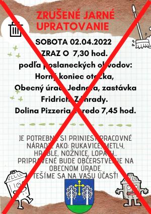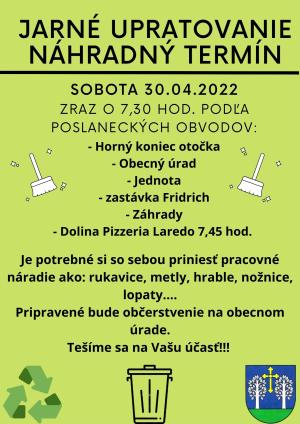 V sobotu 02.04.2022 sa uskutoční jarné upratovanie v našej obci, so stretnutím o 7,30 hod. podľa poslaneckých obvodov: Horný koniec otočka, Obecný úrad, Jednota, zastávka Fridrich, Záhrady. Dolina Pizzeria Laredo 7,45 hod.