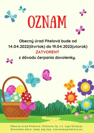 Oznamujeme občanom, že Obecný úrad Pitelová bude od 14.04.2022(štvrtok) do 19.04.2022(utorok) ZATVORENÝ z dôvodu čerpania dovolenky.
