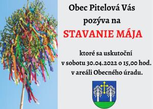 Obec Pitelová Vás pozýva na stavanie mája, ktoré sa uskutoční v sobotu 30.04.2022 o 15,00 hod. v areáli Obecného úradu.