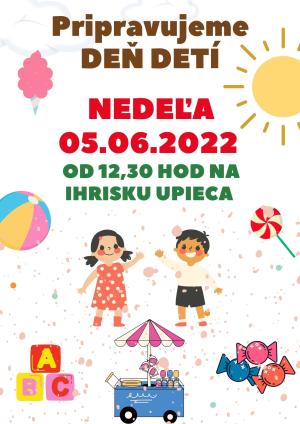 Pozývame všetkých na oslavy Dňa Detí v nedeľu 05.06.2022 od 12,30 hod. na Ihrisko Upieca.