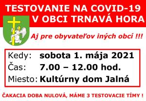 V sobotu 01.05.2021 sa testovanie uskutoční aj v susednej obci Trnavá Hora.