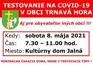 V sobotu 15.05.2021 sa testovanie uskutoční aj v susednej obci Trnavá Hora v čase od 7,30 do 11,00 hodiny.