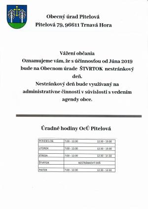Vážení občania, oznamujeme vám, že s účinnosťou od Júna 2019 bude na Obecnom úrade v Pitelovej ŠTVRTOK nestránkový deň. Nestránkový deň bude využívaný na administratívne činnosti v súvislosti s vedením agendy obce.