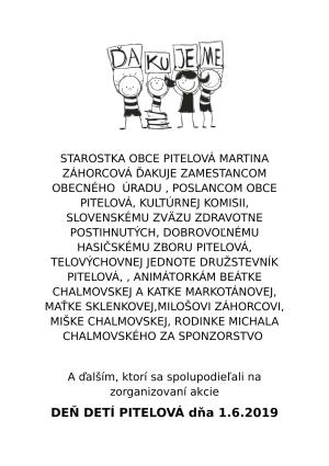 Starostka obce Pitelová, ďakuje všetkým organizátorom a dobrovoľníkom ktorí sa pričinili na organizácií Medzinárodného dňa detí dňa 1.6.2019 na ihrisku Upieca v Pitelovej.