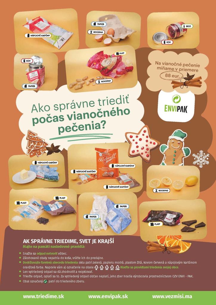 Na plagáte OZV ENVI - PAK nájdete rady, ako triediť počas vianočného pečenia. Nezabúdajte, že pri správnom triedení je potrebné dbať aj na to, aby sme všetko, čo sa dá od seba oddeliť, oddelili.