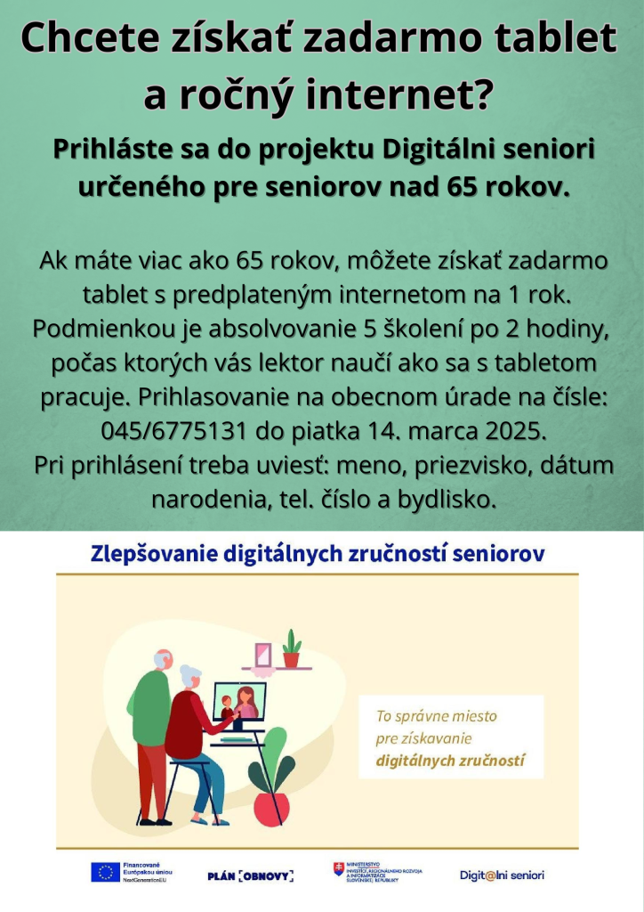 Prihlasovanie na obecnom úrade na čísle: 045/6775131 do piatka 14. marca 2025.