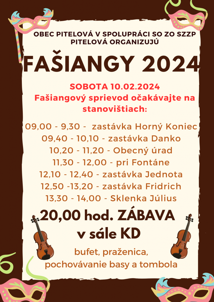 OBEC PITELOVÁ V SPOLUPRÁCI SO ZO SZZP PITELOVÁ ORGANIZUJÚ FAŠIANGY 2024. SOBOTA 10.02.2024 Fašiangový sprievod očakávajte na stanovištiach: