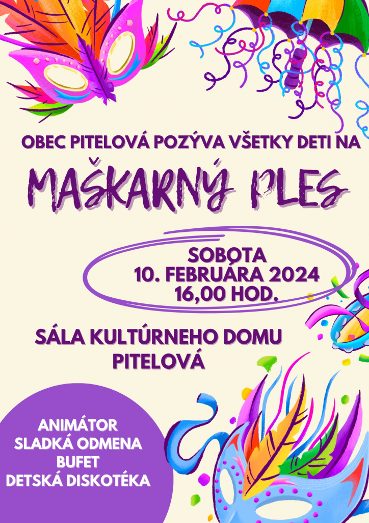 Obec Pitelová pozýva všetky deti na MAŠKARNÝ PLES, ktorý sa uskutoční v sobotu 10. februára o 16,00 hod v sále kultúrneho domu Pitelová.