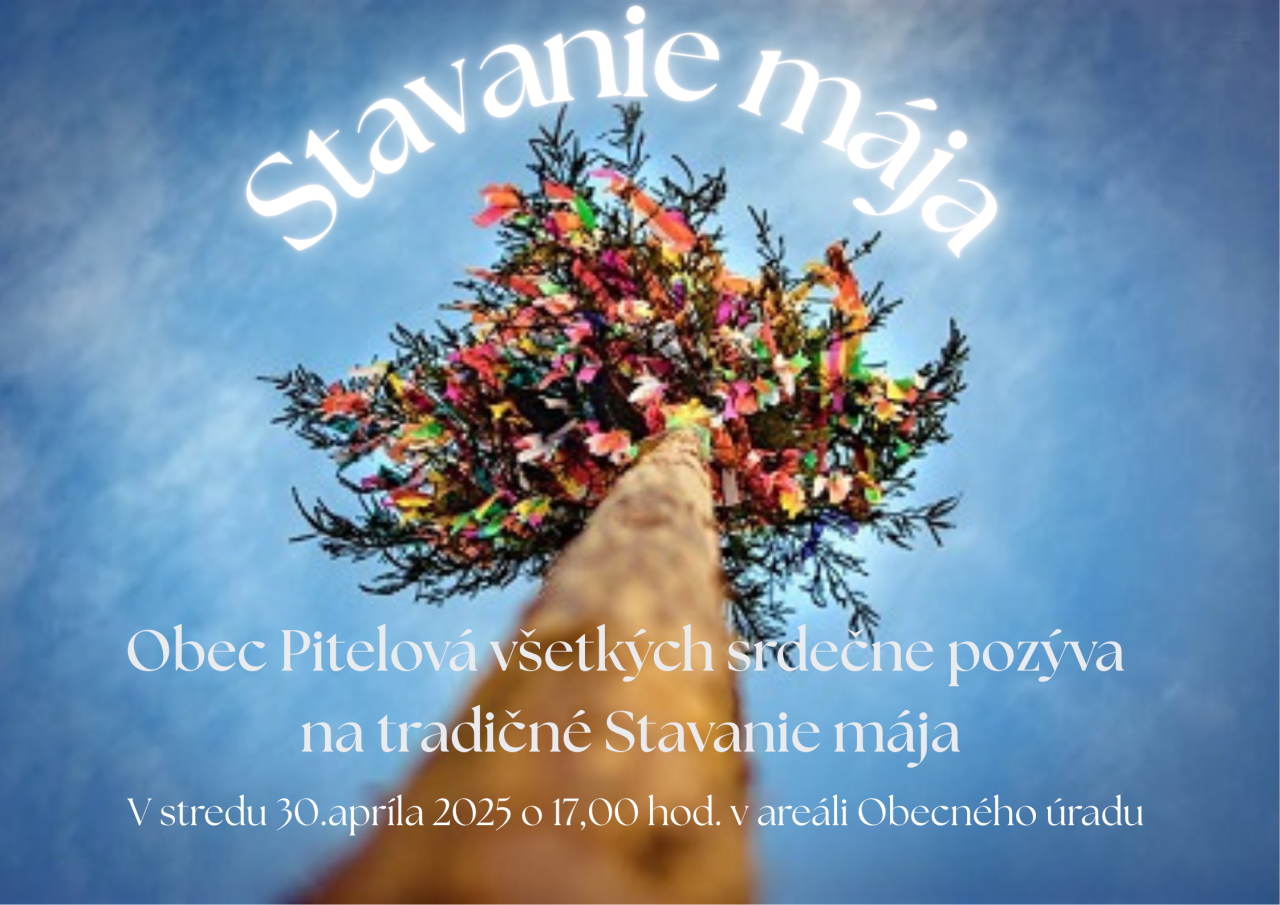 Obec Pitelová všetkých srdečne pozýva na tradičné stavanie mája v stredu 30 apríla 2025 o 17,00 hod. v areáli Obecného úradu.