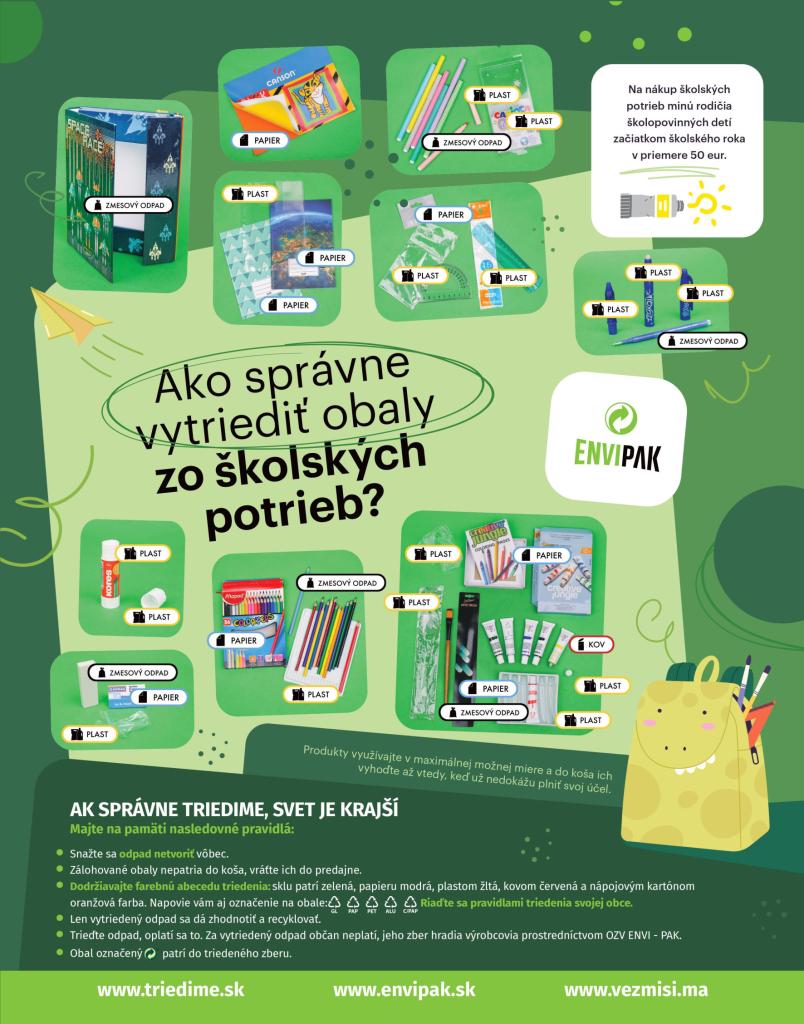 Tento štart so sebou prináša aj množstvo odpadu, najmä z obalov, v ktorých sú školské potreby balené. Na dôležitosť správneho triedenia týchto pomôcok a obalov z nich – nielen na začiatku, ale počas celého školského roka, upozorňuje organizácia zodpovednosti výrobcov ENVI - PAK.
