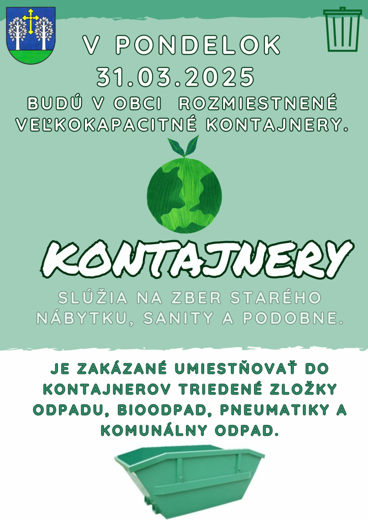 V pondelok 31.03.2025 budú v obci rozmiestnené veľkokapacitné kontajnery.