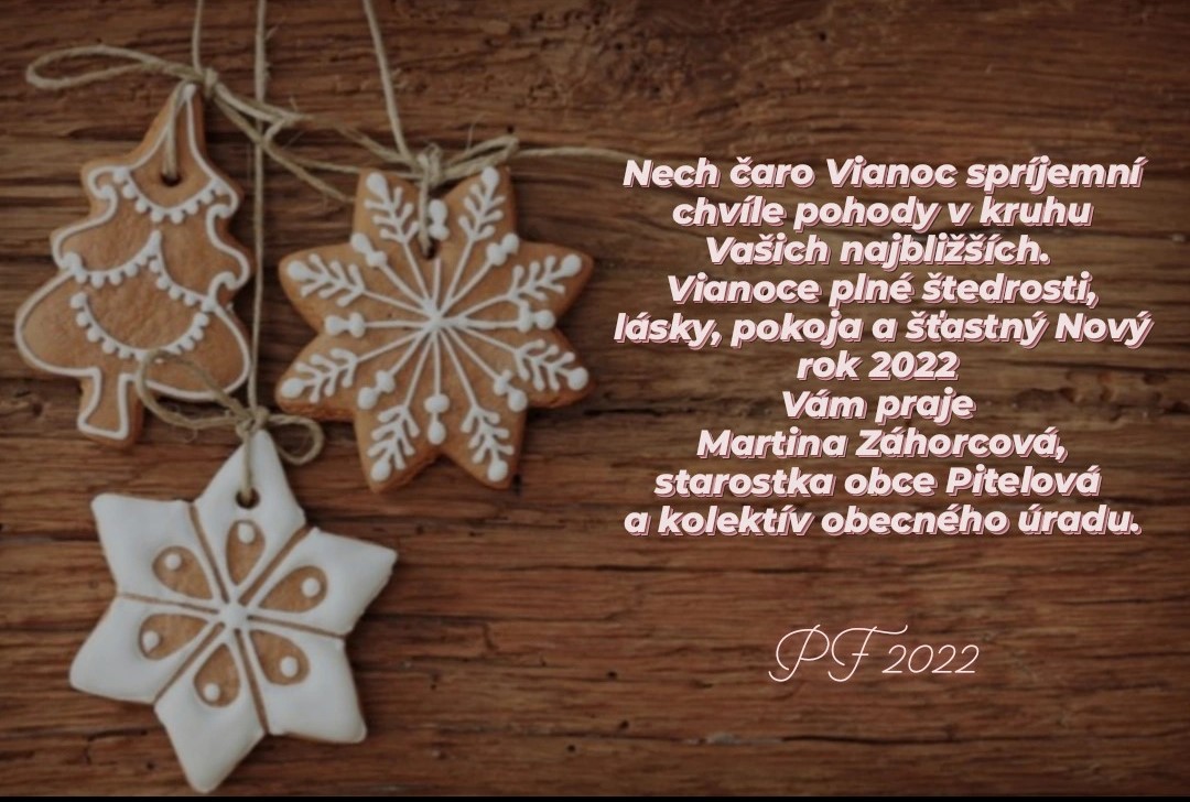 Vianoce plné štedrosti,lásky, pokoja a šťastný Nový rok 2022 Vám praje Martina Záhorcová, starostka obce Pitelová a kolektív obecného úradu.