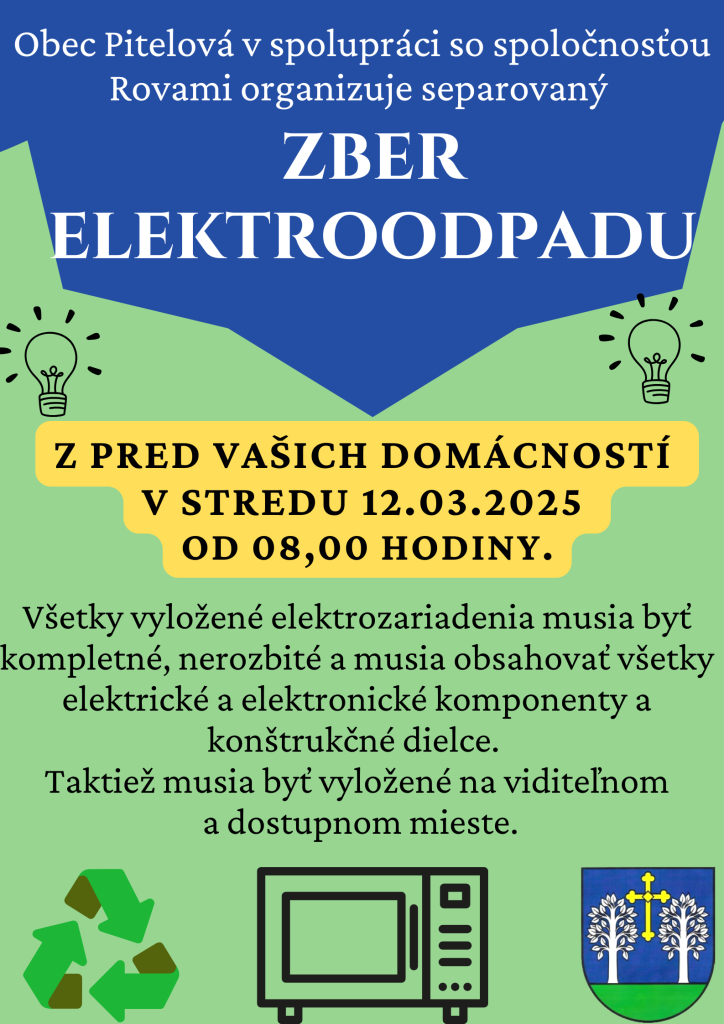 V čase od 07:00 do 08:00 hodiny si vyneste pred dom staré nepotrebné elektrické a elektronické zariadenia. Ide o staré rádiá, TV prijímače, počítače, práčky, mikrovlnky, sporáky, chladničky, mrazničky, vysávače, rýchlovarné kanvice a pod.